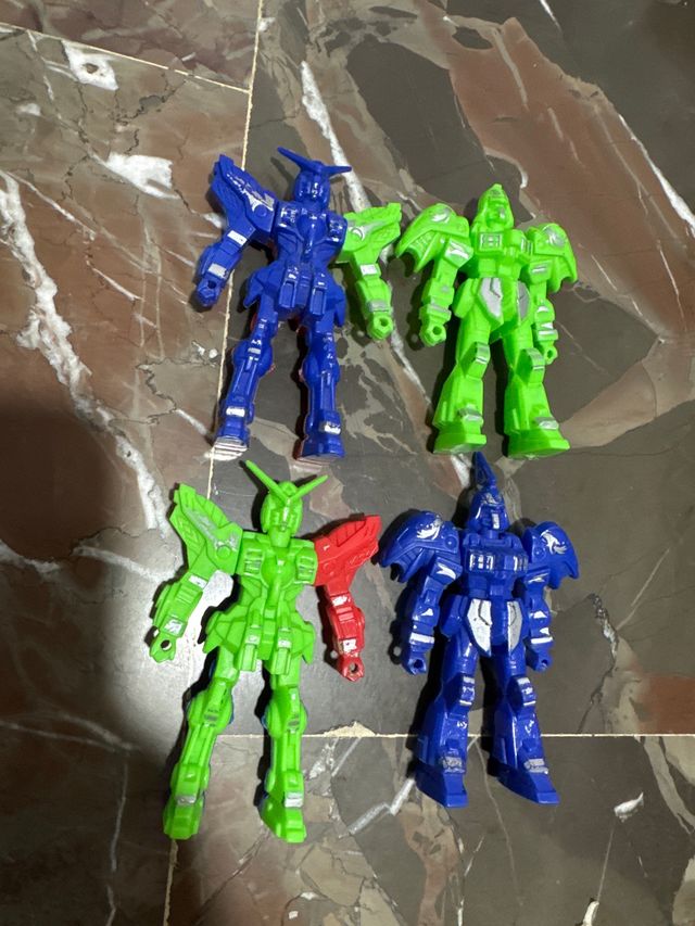 Conjunto de cuatro figuras de robots. - Figuras de robots de plástico. - Colores: azul y verde. - Un robot tiene un brazo rojo.