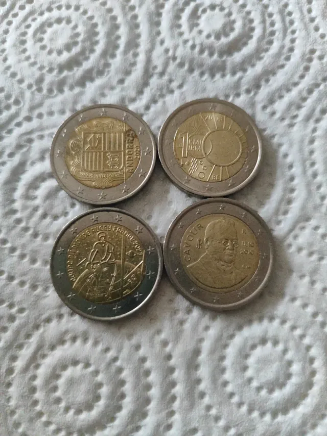 Conjunto de cuatro monedas de 2 euros conmemorativas. - Moneda de Andorra 2020. - Moneda de España 2010. - Moneda de Francia 2008. - Moneda de Italia 2002.