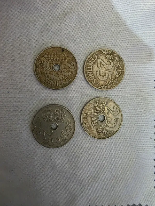 Detalles del productoConjunto de cuatro monedas de 25 céntimos de peseta.