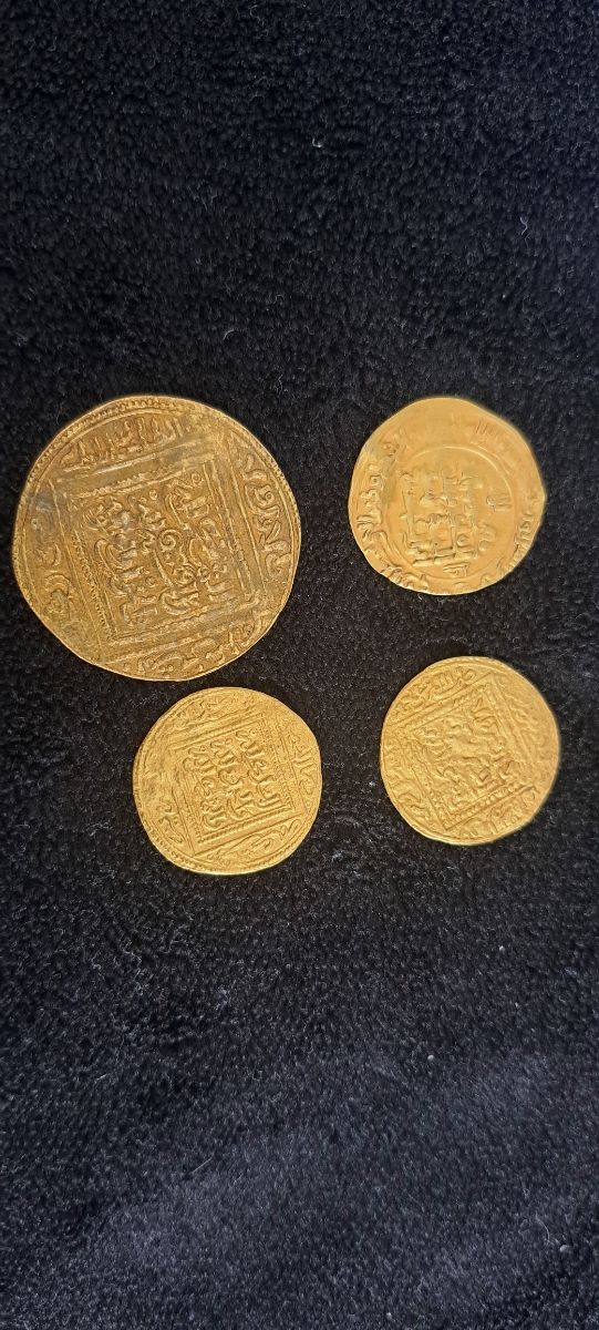 Conjunto de cuatro monedas antiguas de oro con inscripciones árabes. 1 Dinar 3 medio Dinar No hago envios