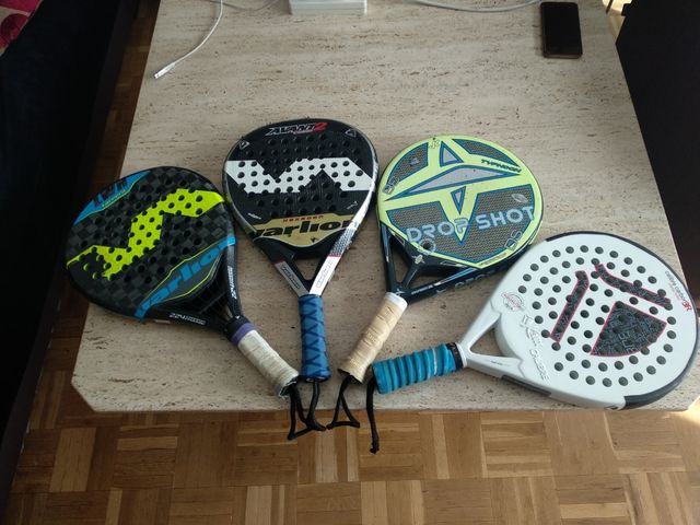 Detalles del productoConjunto de cuatro palas de pádel con diferentes diseños y marcas.