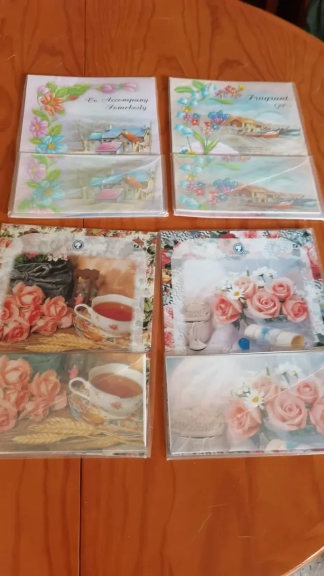 Conjunto de cuatro paquetes de papel de olor vintage con diseños florales y escenas. - Diseños variados. - Ideal para coleccionistas o amantes de lo retro.