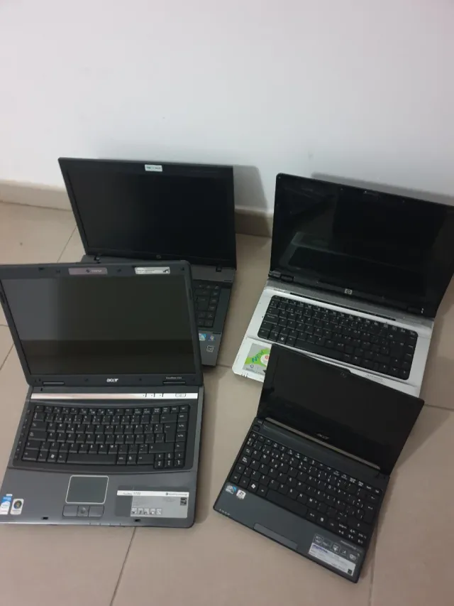Detalles del productoLote de cuatro portátiles viejos para piezas. Ideales para cacharear o sacar piezas. En el lote hay dos portátiles acer que funcionan sin problemas y vienen con sus cargadores, el detalle es que siempre tienen que ir enchufados. Y luego hay dos portátiles hp al que uno le falta el disco duro pero enciende y el otro al tratar de encenderlo siempre se apaga.
