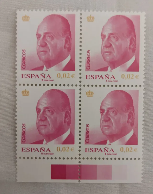 4 sellos de España de 0,02€. - Retrato del Rey Juan Carlos I. - Diseño de Correos. - Valor facial: 0,02€.