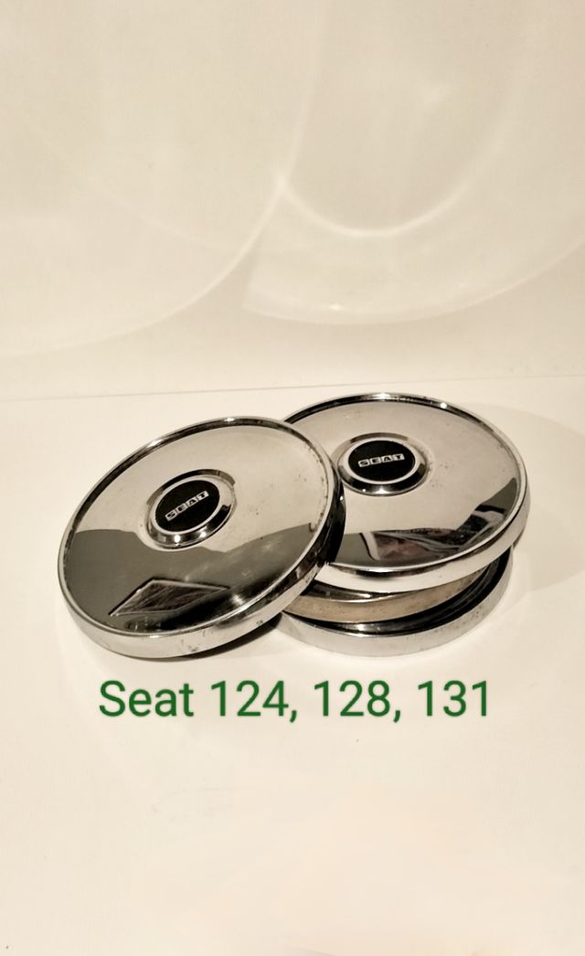 Lote 4 tapacubos Seat originales en estado usado, válidos para modelos 124 FL, 131 L motor 1430, 128, ...mirar bien fotos individuales de cada unidad, hay uno que el cromado está más oscurecido.