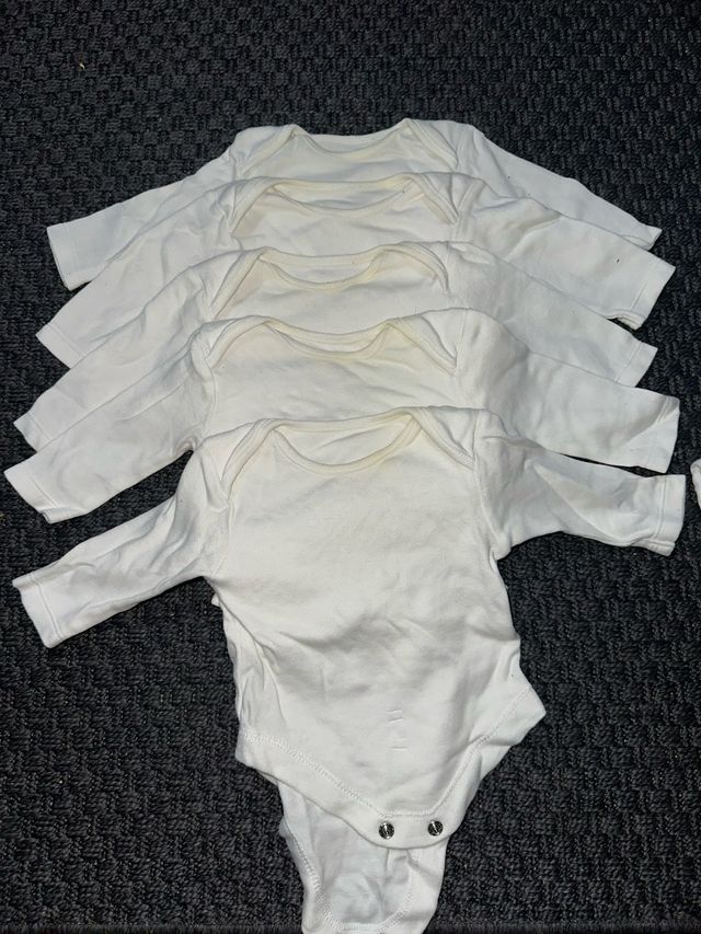 Detalles del productoConjunto de cinco bodys blancos para bebé, perfectos para el día a día.
