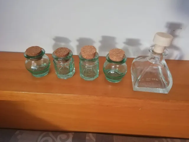 Conjunto de cinco pequeños botes de cristal con tapón de corcho. Vendo los 5 por 4€.