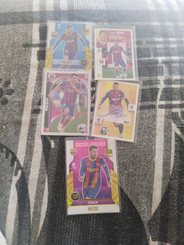 Conjunto de cinco cromos del futbolista Messi. - Cromos de colección. - Incluye varios modelos de Messi.