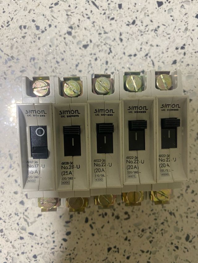 Conjunto de cinco interruptores automáticos Simon/Siemens. - Un interruptor de 15 A. - Tres interruptores de 20 A. - Un interruptor de 25 A. 7€ por unidad.