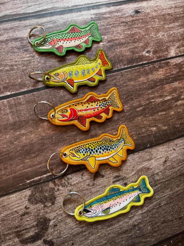 Detalles del productoSet de 5 llaveros bordados de pesca de gran calidad. Diferentes tipos de truchas.