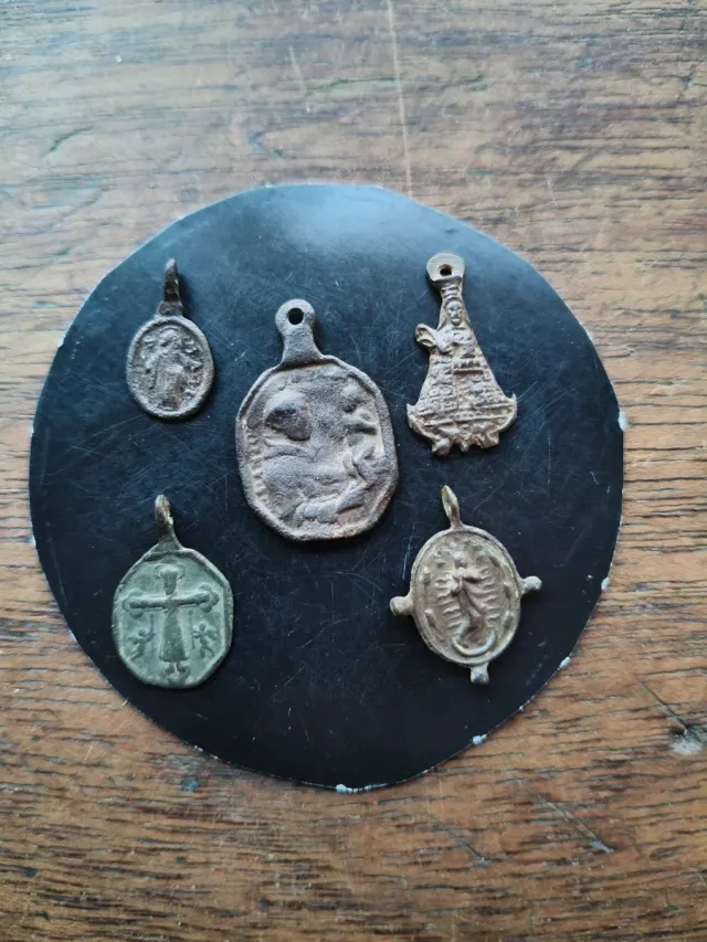 Conjunto de cinco medallas religiosas antiguas. - San Magín de Tarragona. - Virgen de Guadalupe. - Virgen de Loreto. - Virgen inmaculada. - Regalo San Antonio.