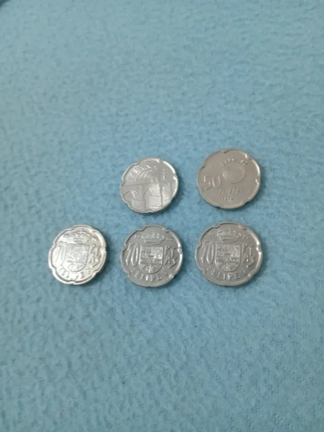 Conjunto de cinco monedas antiguas con escudos. - Moneda de 50 pesetas