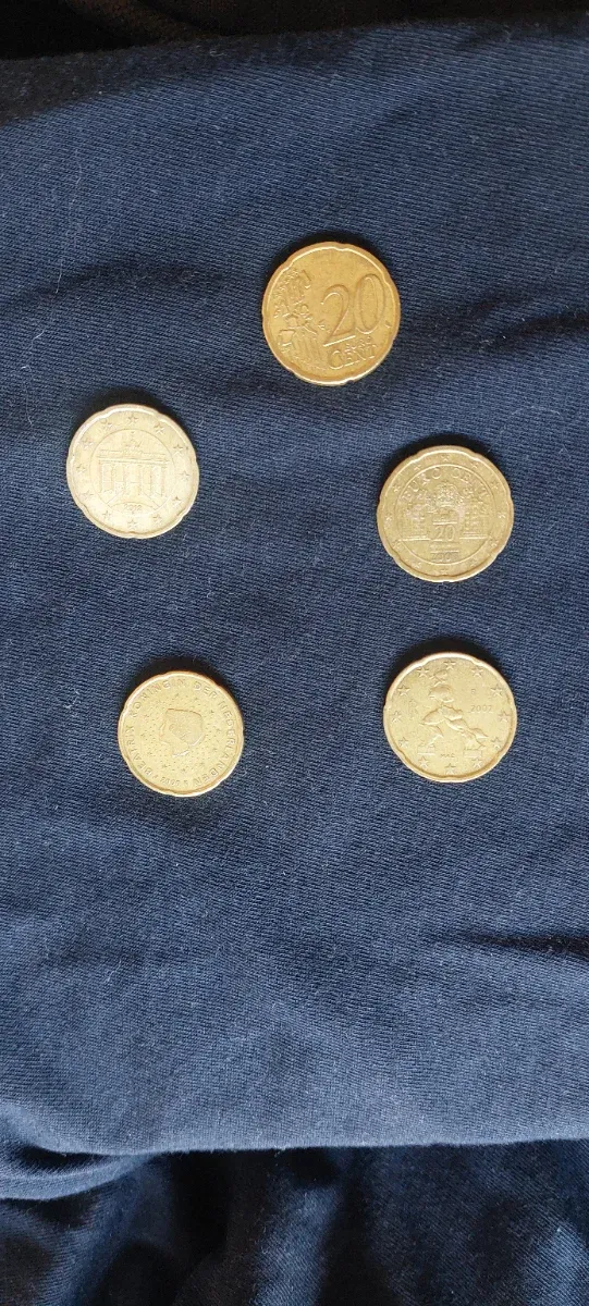 Detalles del productoConjunto de cinco monedas de euro de diferentes países.