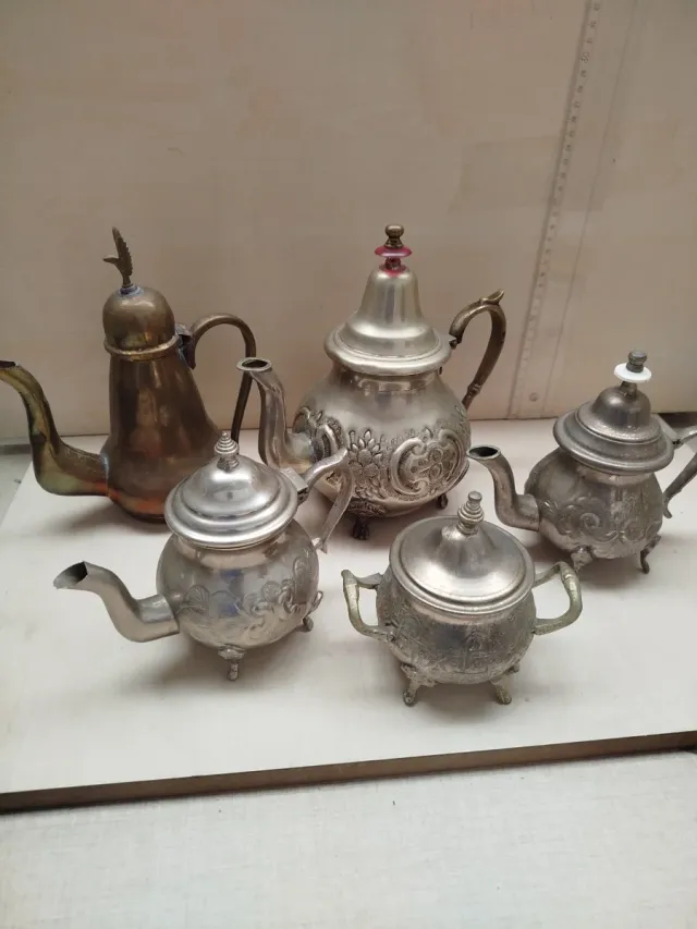 Detalles del productoConjunto de teteras de estilo vintage para decoración ,no funcionales.elaboradas en metal.según imágenes.precio del conjunto.no separo.precio no negociable