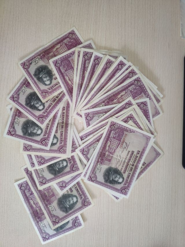 Detalles del producto50 billetes españoles. Buenas y regulares conservaciones, ninguna rotura. 50 pta año 1928. Se envían los de la foto. Envíos a elegir: Wallapop-envíos; Agencia de transportes, o por Correos certificado 5 eur. Tarifa plana. Acumula lotes sin incremento en los gastos de envío. Pagos a elegir por: wallapay, transferencia, ingreso en cuenta bancaria, o Bizum. Entrega en mano en Villena.