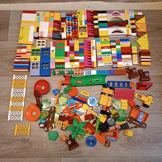 Detalles del productoGran lote de 500 piezas muy, muy variadas y totalmente compatibles con Lego Duplo. Piezas de todos los colores y tamaños, flores, tobogán grande, columpios, vallas, árboles...