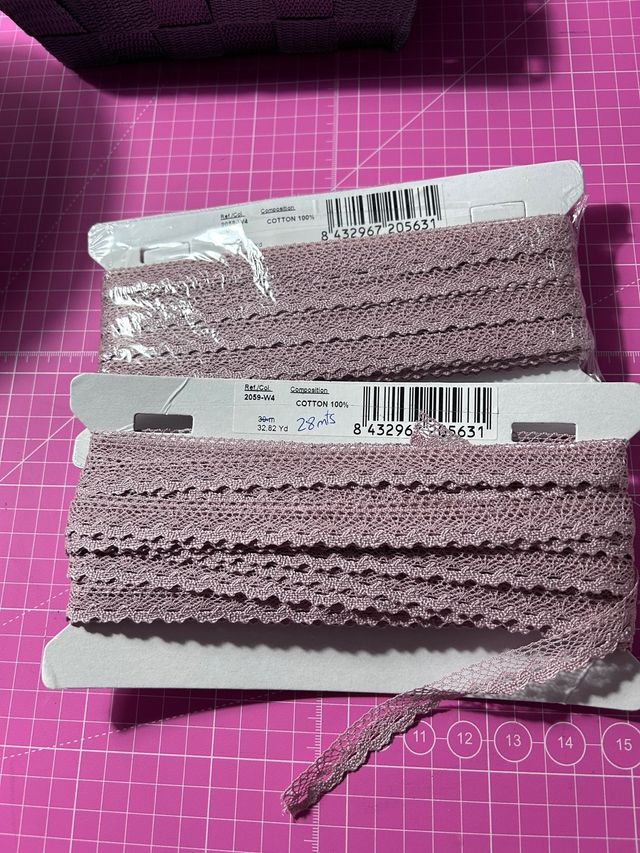 Detalles del productoLote de puntilla de algodón en color rosa empolvado. Ideal para manualidades y costura.