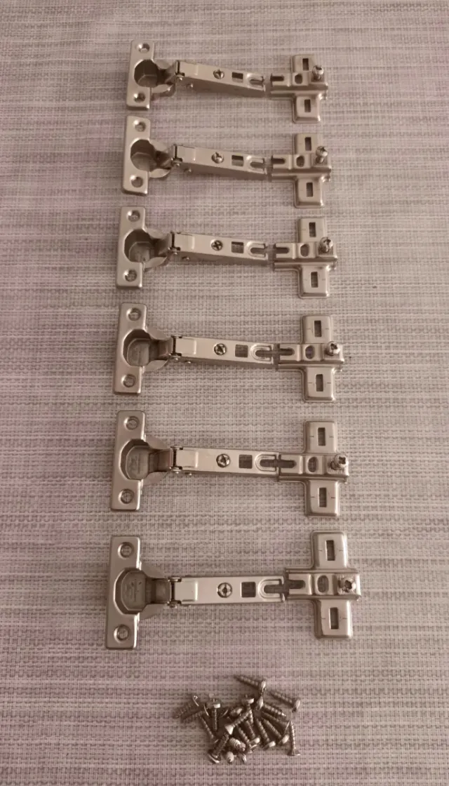 Se vende lote de seis bisagras para muebles, ideales para armarios o puertas. - Material: Metal. - Color: Plateado. - Incluye tornillos para su instalación.