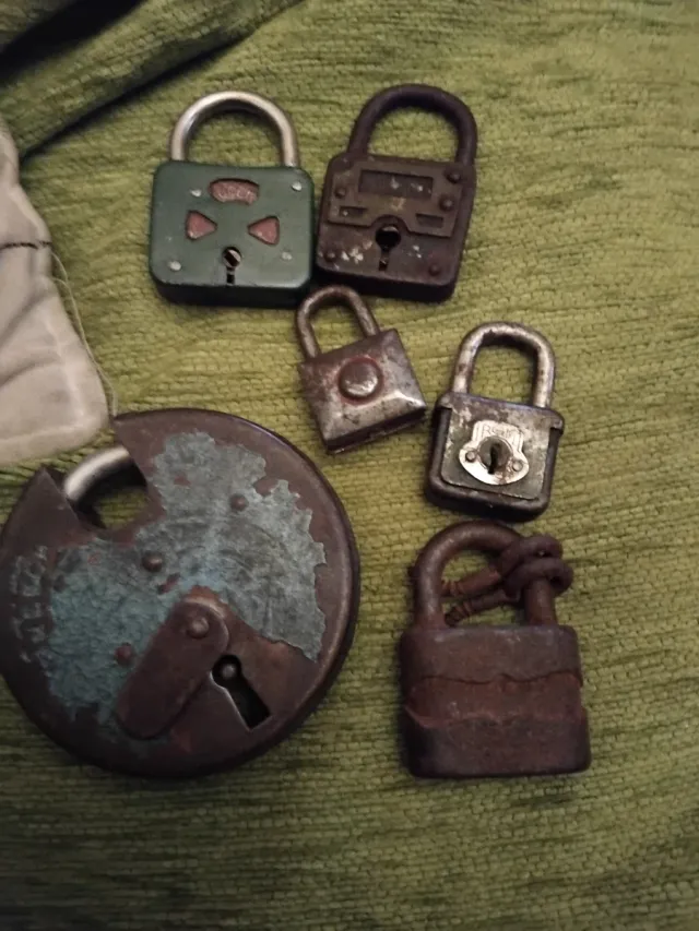 Detalles del productoConjunto de seis candados de estilo antiguo. Presentan un aspecto rústico y vintage.