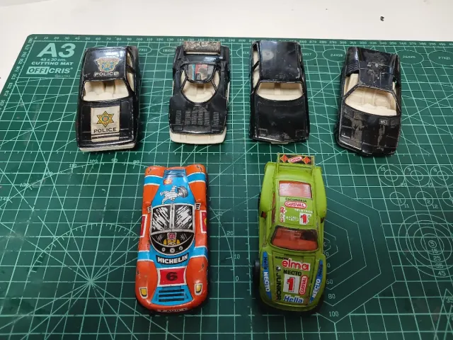 Detalles del productoConjunto de seis coches de juguete antiguos, ideales para coleccionistas.