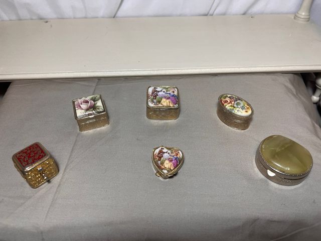 Detalles del productoPrecioso conjunto de 6 pastilleros antiguos de metal plateado y tapa de porcelana pintada.