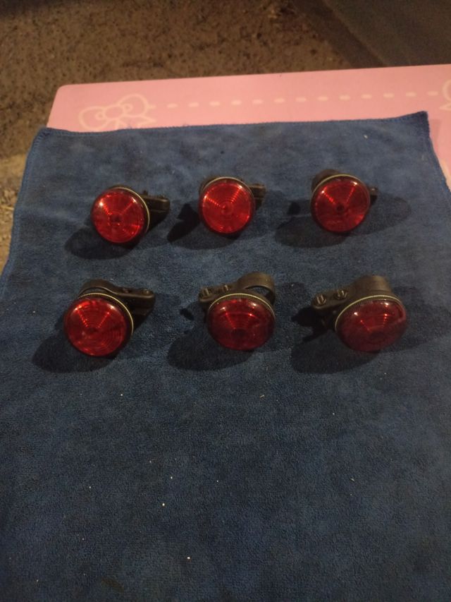 Se vende lote de seis pilotos traseros a pilas. Son ideales para bicicletas. - Dos posiciones de luz. - Color rojo.