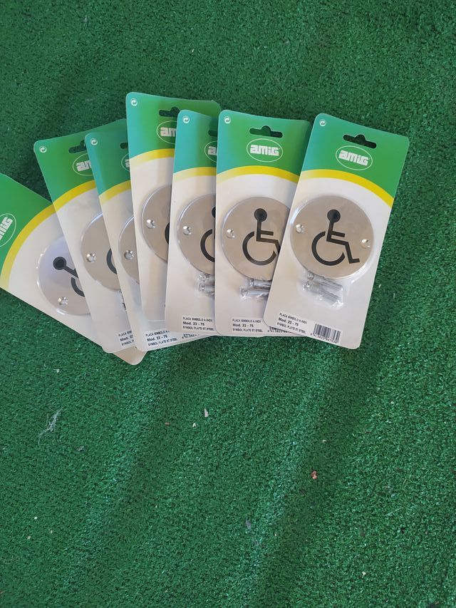 Detalles del productoSe venden 6 placas redondas de acero inoxidable con el símbolo de accesibilidad universal.