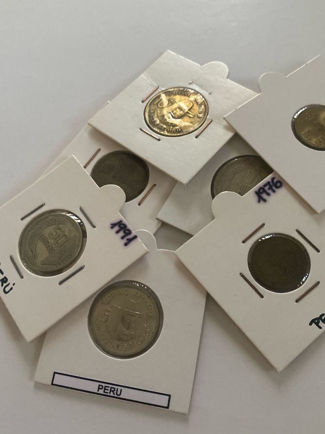 Detalles del productoConjunto de siete monedas de Perú, cada una protegida individualmente.