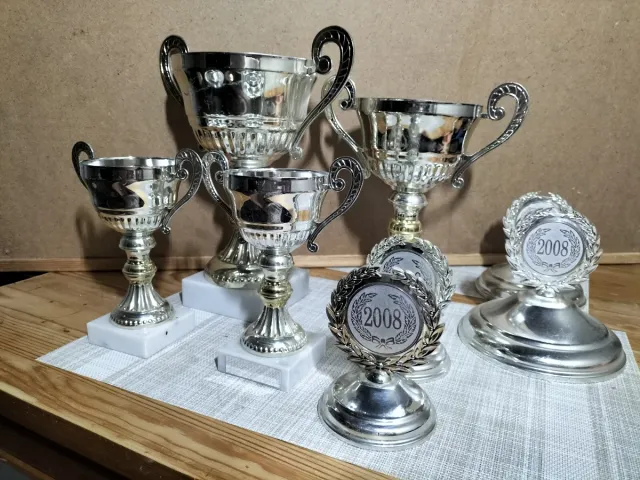 Detalles del productoConjunto de 8 trofeos de diferentes tamaños y diseños, con acabados en plata y detalles dorados.