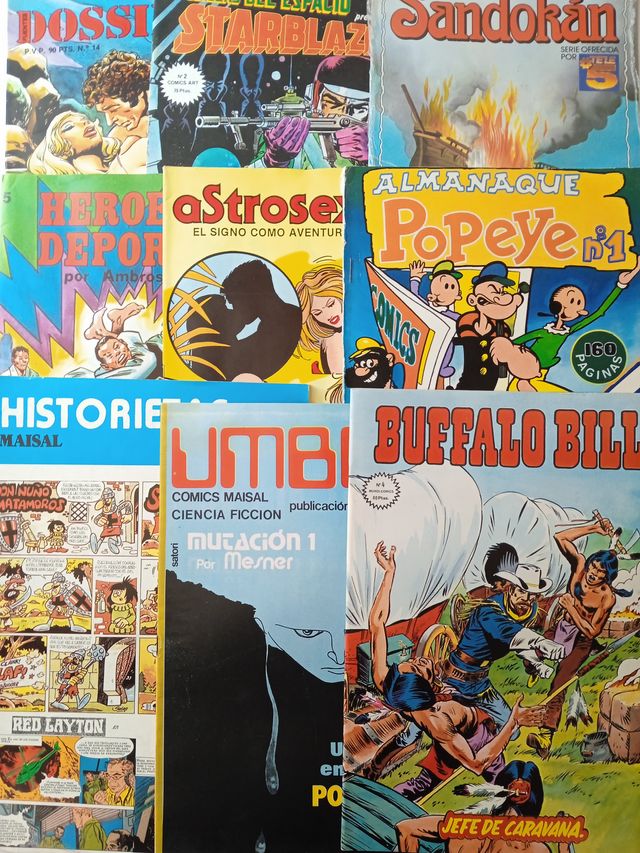 Odiseas del Espacio nº 2 Starblazer ¡Cúpulas de muerte! / Sandokan nº 2 Planeta-Agostini Cómics / Almanaque Popeye nº 1 / Astrosex Escorpion – J. Fuentes Ediciones / Héroes del deporte nº 5 Valenciana / Dossier X nº 14 / Umbral nº 2 Maisal / Buffalo Bill nº 4 Ediciones Vértice y Historietas Maisal nº 8.