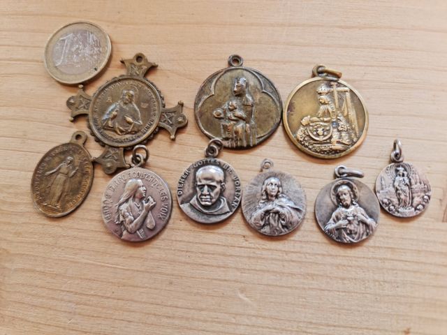 Conjunto de nueve medallas religiosas con diferentes diseños. - Variedad de imágenes y grabados. - Piezas de colección. - Ideal para devoción o coleccionismo.