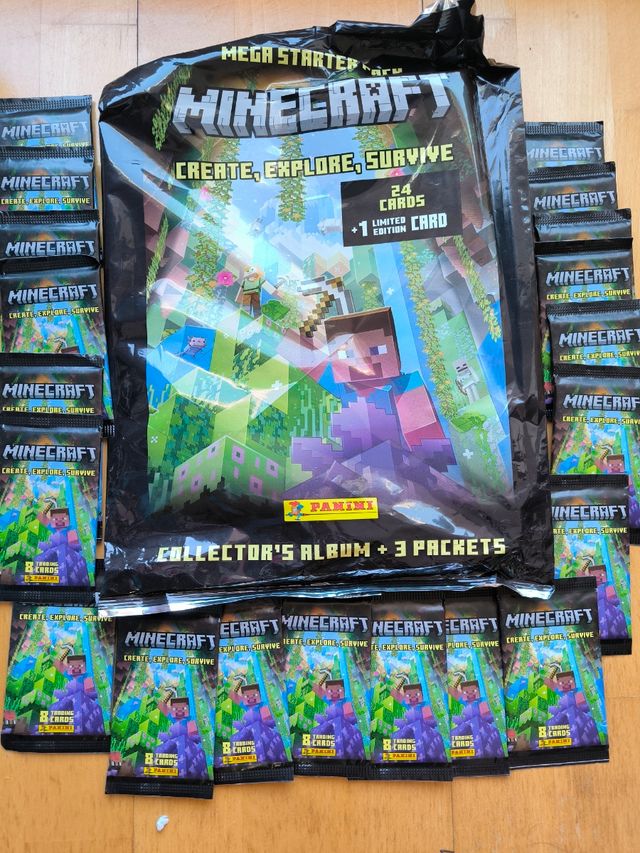 Detalles del productoLote álbum + 1 carta edicion limitada + 23 sobres de Minecraft Trade Collection con 8 cartas cada una ( total 184 cartas) de la colección create explore survive de Panini trading cards . El precio de mercado es 70 euros . Posibilidad de más sobres por 2.5 euros unidad. Sin abrir nuevos