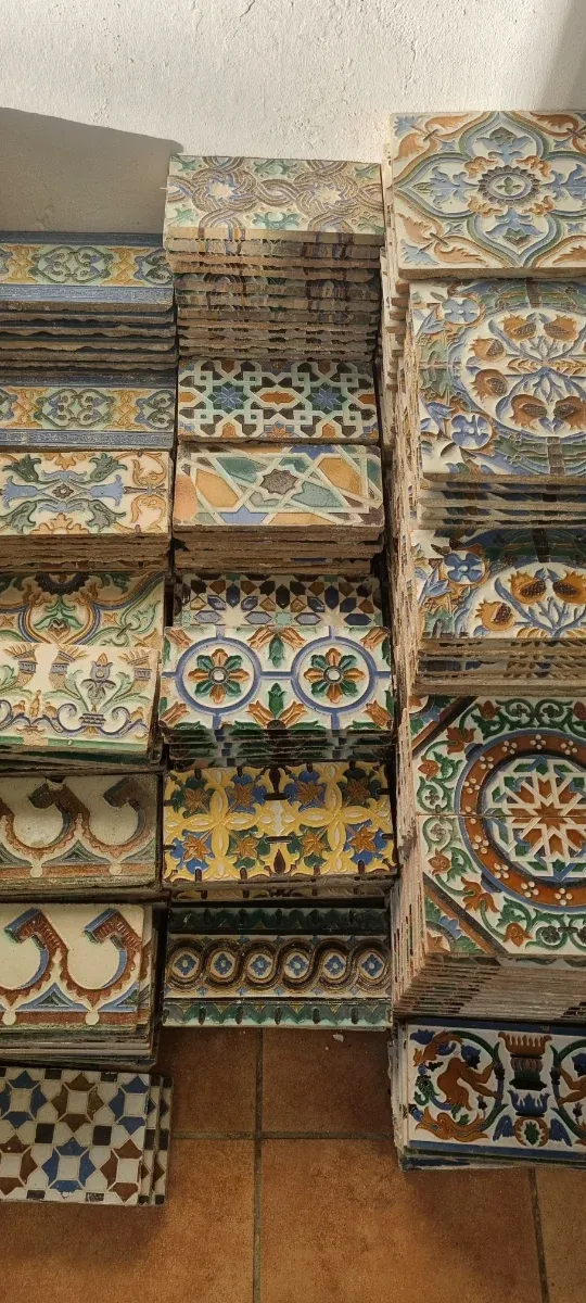Detalles del productoConjunto de azulejos antiguos de cerámica con diseños decorativos.