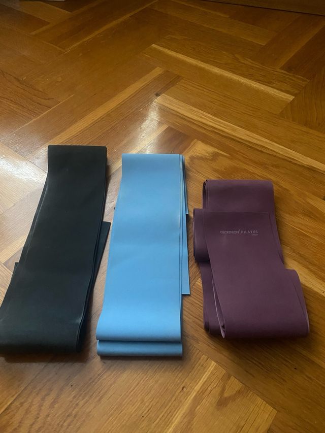 Lote de tres bandas elásticas para pilates, ideales para entrenamientos de fuerza y tonificación. - Banda negra. - Banda azul. - Banda morada.
