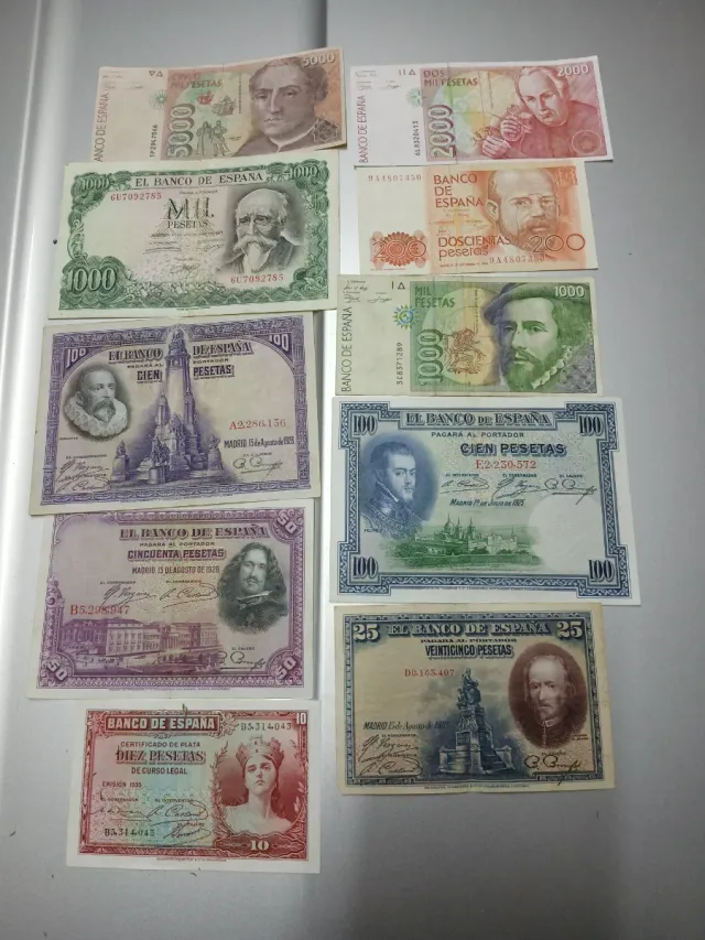 - Billetes de 5000, 2000, 1000, 200, 100, 50, 25 y 10 pesetas.