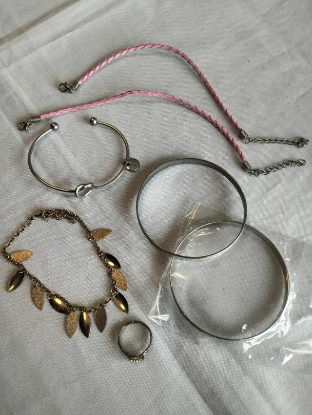 Detalles del productoConjunto de bisutería que incluye varias pulseras y un anillo.