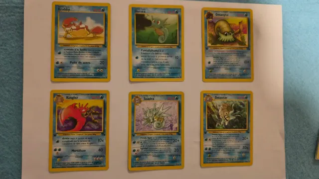 Conjunto de cartas Pokémon de etapa 1, incluyendo Kingler, Seadra y Omastar. - Carta Krabby - Carta Horsea - Carta Omanyte