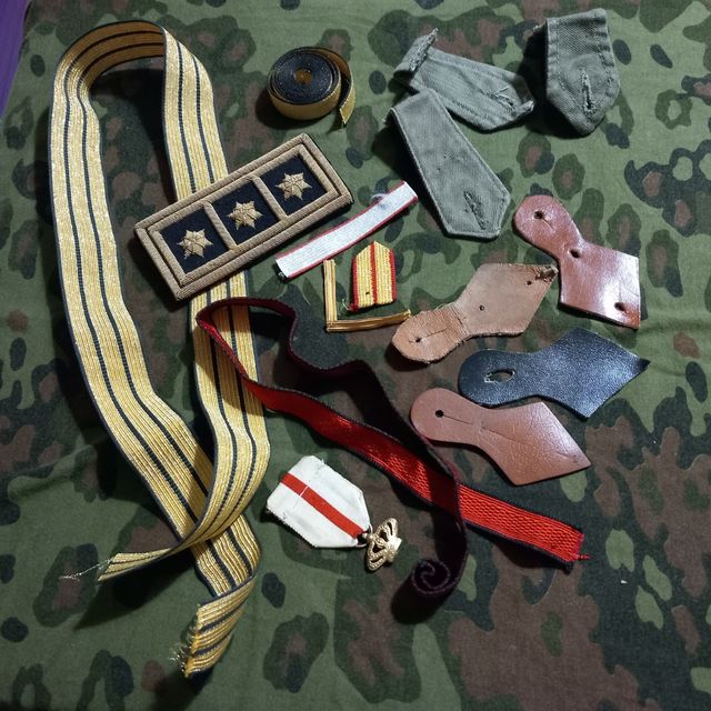 Detalles del productoLote de cintas y efectos militares varios. La longitud de la cinta ancha dorada/azul es de 3 cm ancho y 75 cm de largo. La cinta roja mide 1,5 cm de ancho y 51 cm de largo. La cinta dorada estrecha mide 91 cm de largo.