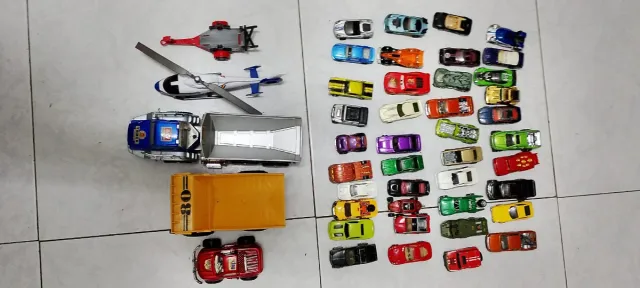 Detalles del productoLote de coches de juguete de diferentes modelos y colores (muchos de ellos Hot Wheels). Incluye vehículos como camiones, helicópteros y coches pequeños.