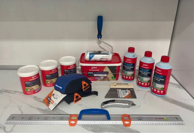 Detalles del productoLote de productos para la instalación de suelos vinílicos sobre baldosa.