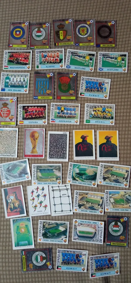 Detalles del productoLote de 38 cromos Mundial España 82 Panini,nunca pegados, señales de uso normales pero bien conservados. Hay 5 repetidos, está el n.1, hay escudos,sedes, estadios, equipos,ver fotos.
