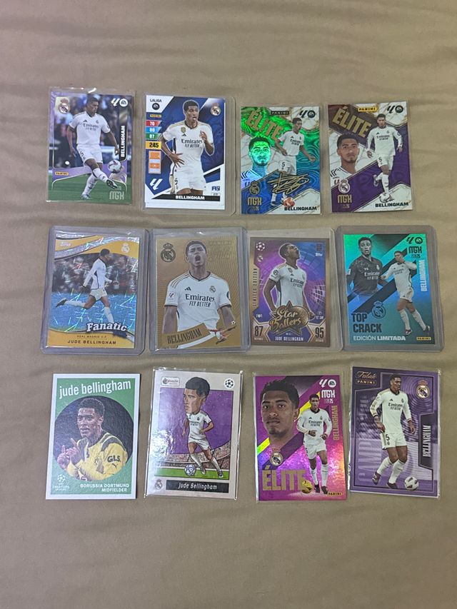 Detalles del productoLote de cromos de Jude Bellingham, incluyendo varias ediciones y equipos.