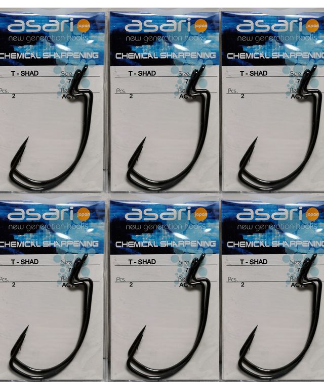 Detalles del productoLote de 12 anzuelos originales de calidad marca Asari y modelo T-Shad talla 7/0. El lote se compone de 6 blisters con 2 anzuelos cada uno.