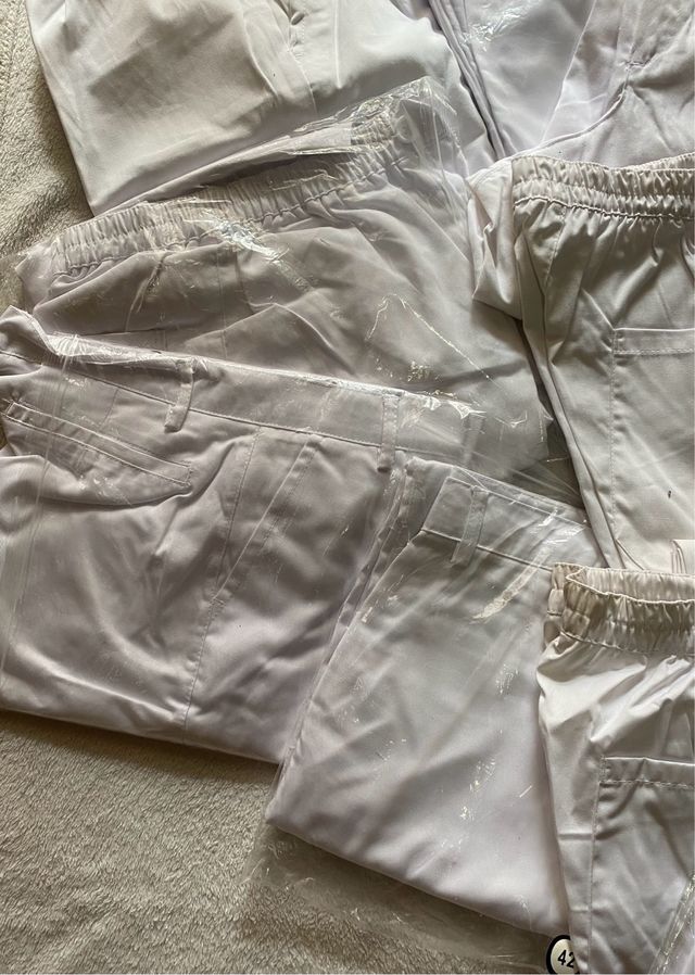 Detalles del productopantalon blanco peña, medico, panader@,etc. Con gomas en cintura algunos y boton y cremallera otros. marca Valento y vertice. lote de 13 pantalones diferentes tallas. Precio del lote 48€ por cierre de negocio.