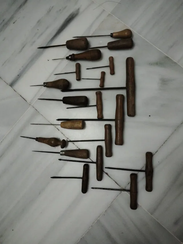 Conjunto de herramientas antiguas de carpintería, incluyendo barrenas, berbiquín y punzones. - Mangos de madera. - Puntas metálicas afiladas.