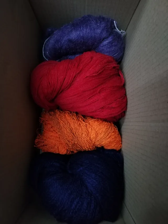 Detalles del productoCaja llena de diferente tipo de hilo, Mohair, algodón, poliamida etc.