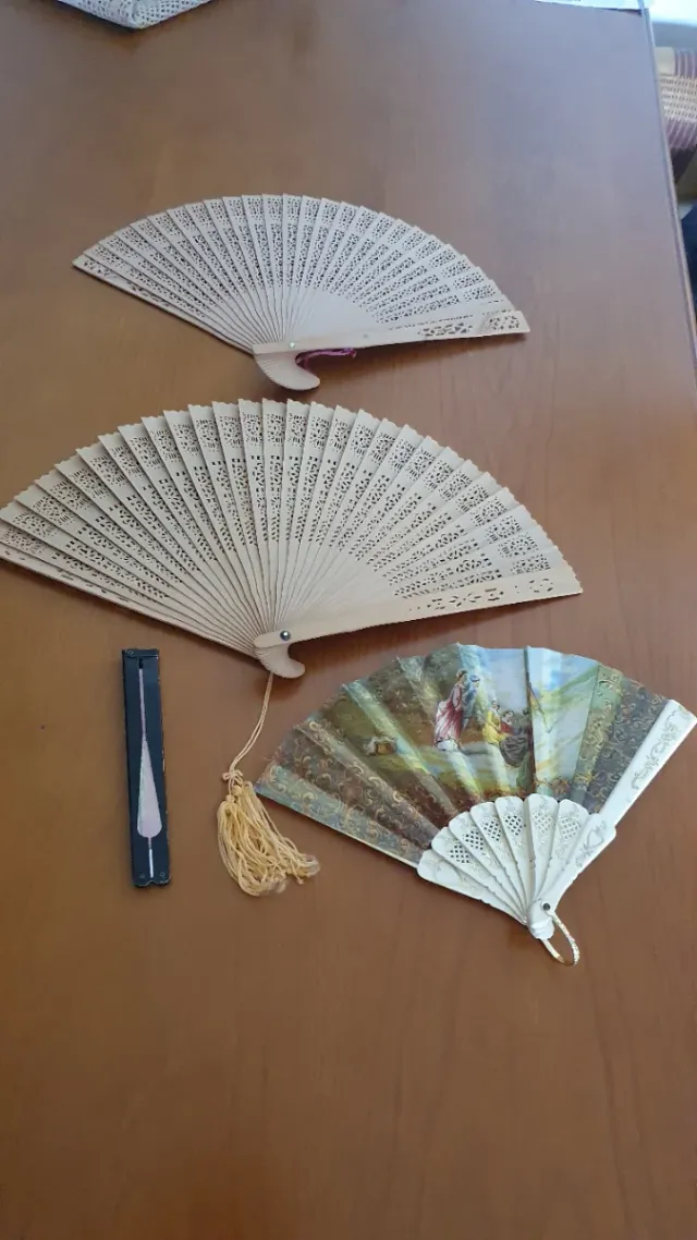 Lote de 3 Abanicos de Madera Tallada y 1 d bolsill