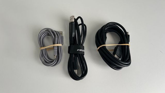 Conjunto de tres cables de conexión USB, uno gris y dos negros. - Cables USB gris con conector tipo A y mini-USB.