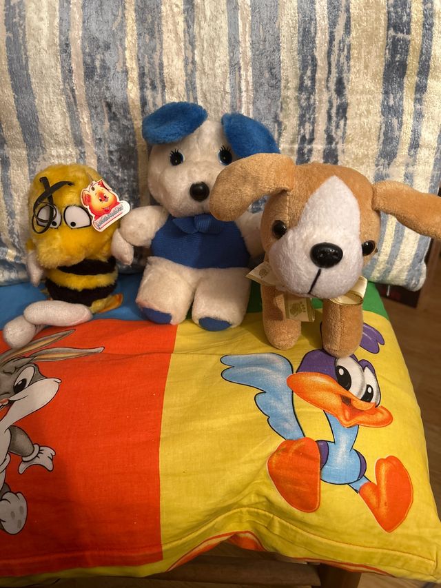 - Peluche de abeja amarilla con rayas negras y etiqueta.