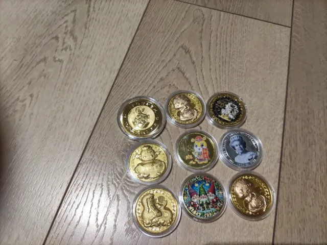 Detalles del productoConjunto de nueve monedas conmemorativas, cada una con un diseño único y detallado.